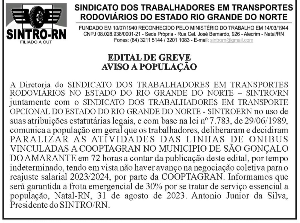 A direção do SINTRO RN – Sindicato dos Trabalhadores em Transportes Rodoviários do RN, juntamente com o SINTROERN – Sindicato dos Trabalhadores em Transportes Opcional do RN, vem comunicar que após reunião hoje a noite com a Cooptagram, cooperativa que presta serviço de transporte público na cidade de São goncalo RN, as partes não chegaram a um acordo nas negociações salariais e com isso a GREVE publicada para as primeiras horas de amanhã está mantida.