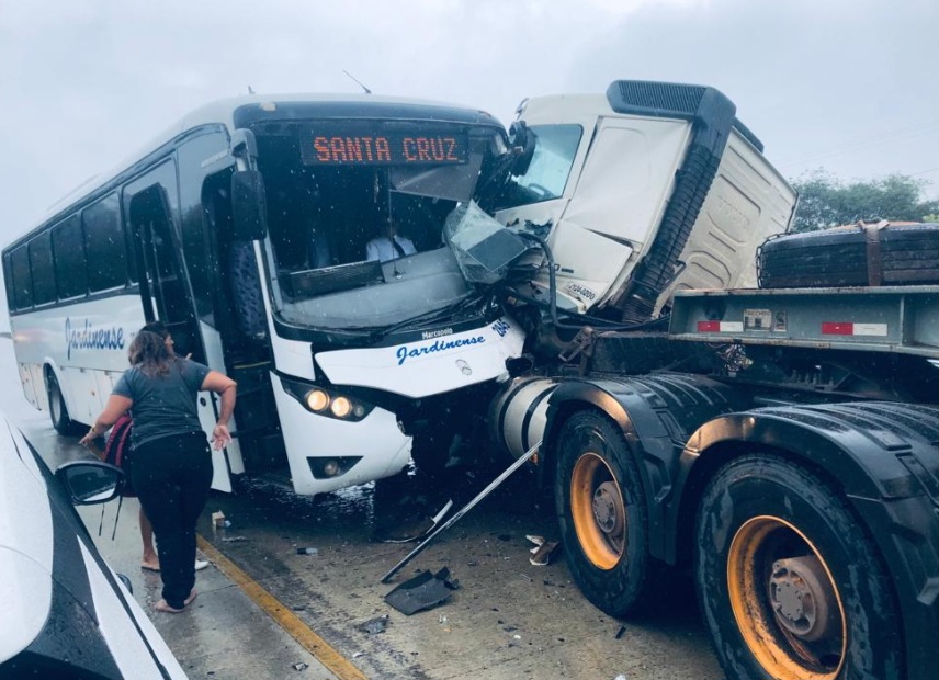 Um ônibus intermunicipal da empresa Jardinense bateu de frente com uma carreta que transportava uma pá eólica, na manhã desta segunda-feira (18), na Reta Tabajara/BR 304, em Macaíba.