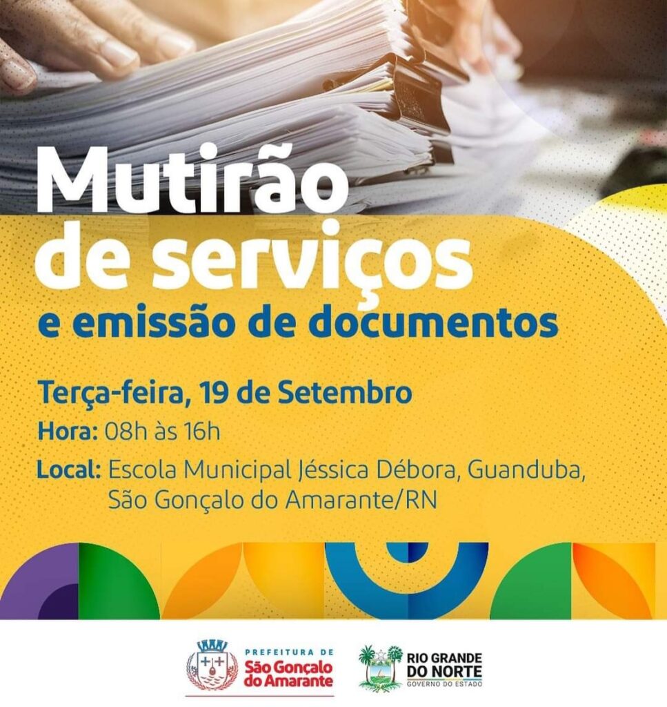 Participe do Mutirão de Documentação da Prefeitura de São Gonçalo do Amarante e do Governo do Estado no dia 19/09/2023, das 8h às 16h, na Escola Municipal Jéssica Débora.
