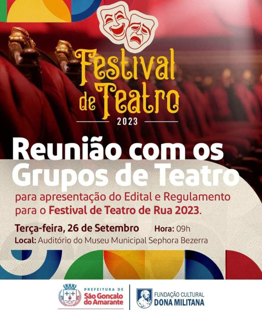 Nesta terça-feira (26), às 9h, estão convocados todos os grupos de teatro da cidade para uma reunião de apresentação do edital e regulamento do Festival de Teatro de Rua. O encontro acontece no auditório do Museu Municipal Sephora Bezerra e sua participação é muito importante.