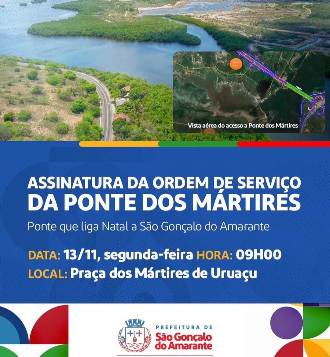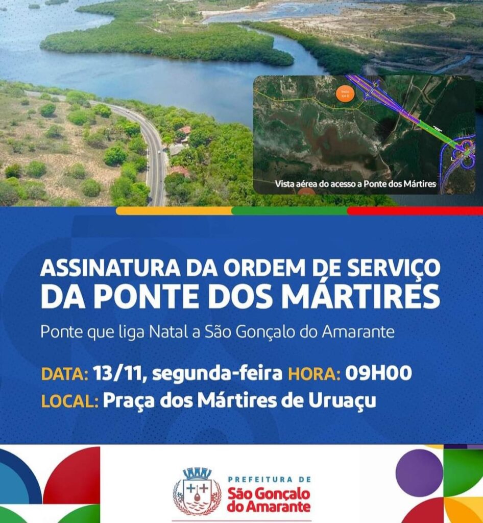 Um marco para a mobilidade e o turismo religioso! A Ponte dos Santos Mártires, que ligará São Gonçalo do Amarante a Natal, vai se tornar realidade. A ordem de serviço será assinada na próxima segunda-feira (13), às 9h, na Praça dos Mártires de Uruaçu. Este projeto incrível é fruto da parceria entre a Prefeitura de São Gonçalo do Amarante e o Ministério do Desenvolvimento Regional.