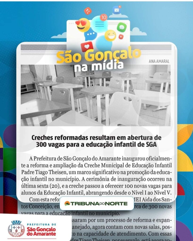 A Tribuna do Norte destacou a ampliação de vagas na creche Padre Tiago Theisen, reformada e ampliada pela Prefeitura de São Gonçalo
