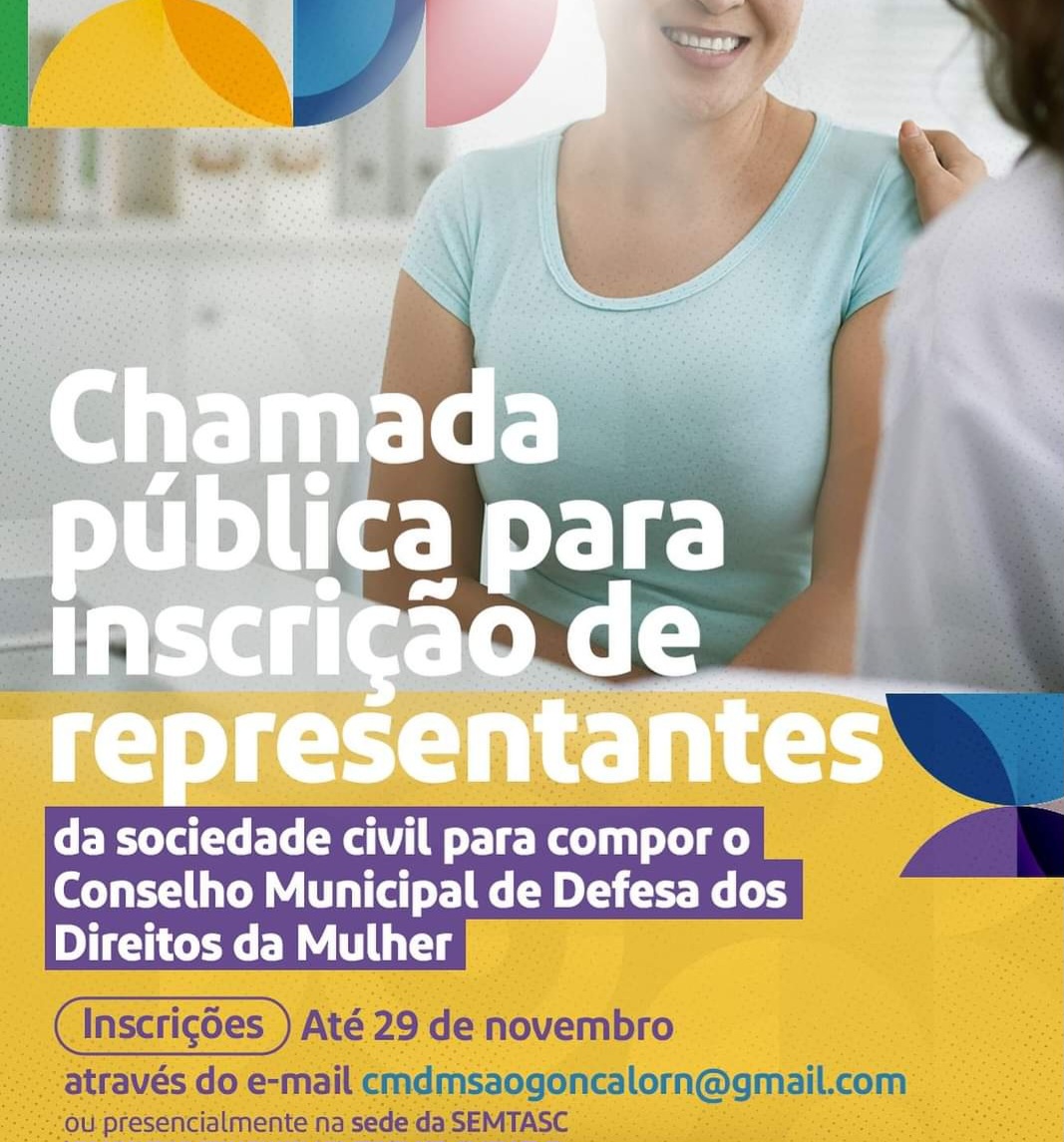 A Prefeitura de São Gonçalo publicou a chamada pública para composição do Conselho Municipal de Defesa dos Direitos da Mulher – CMDM. As inscrições vão até o dia 29/11 através do e-mail cmdmsaogoncalorn@gmail.com ou presencialmente, na sede da Semtasc.
