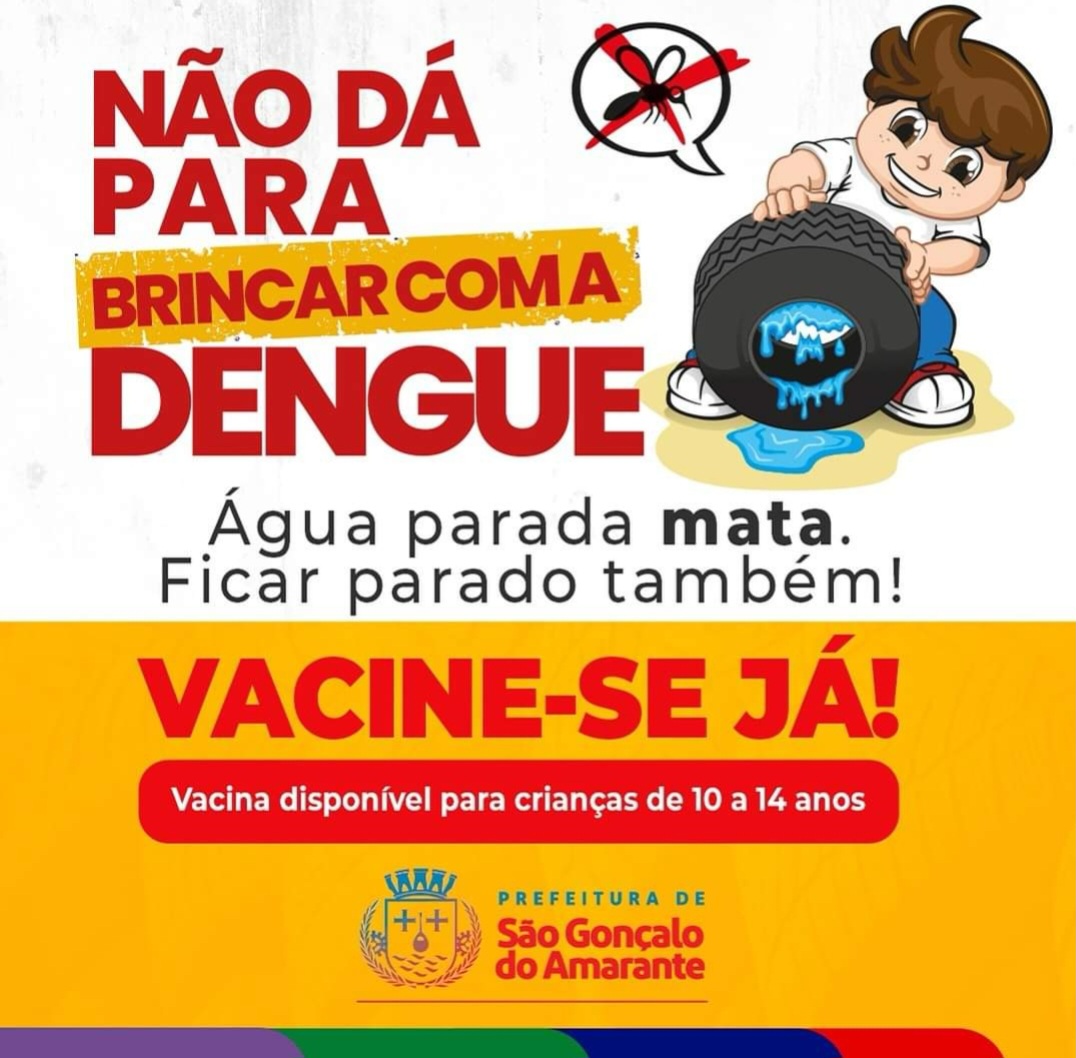 Água parada mata e não fazer nada TAMBÉM! Crianças de 10 a 14 anos estão aptas a vacinação e em qualquer Unidade Básica de Saúde do Município de São Gonçalo do Amarante você encontra vacinas disponíveis!