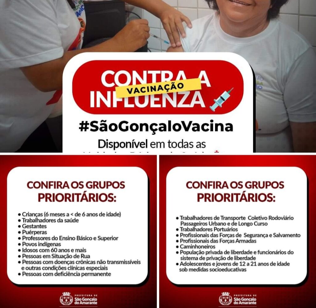 Em São Gonçalo, a vacina contra a influenza já está disponível em todas as nossas unidades básicas de saúde. É hora de se proteger e cuidar da sua saúde e da sua família!
