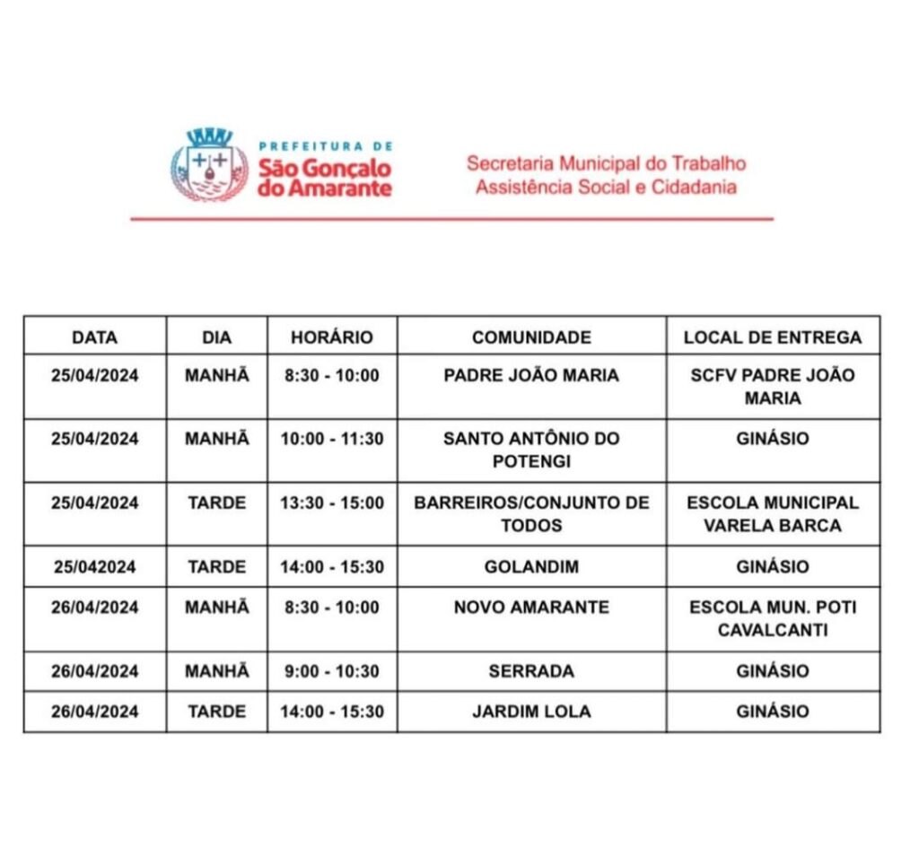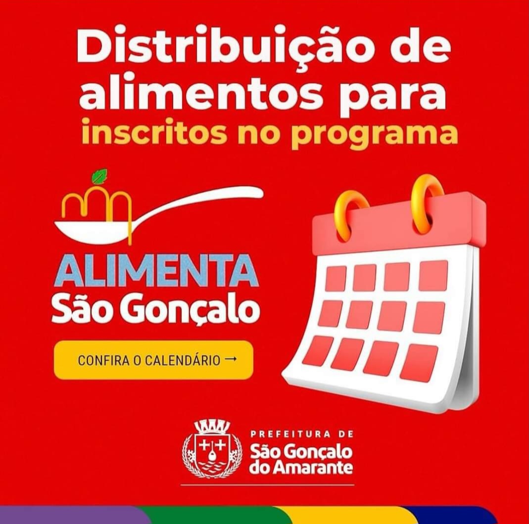 A Prefeitura de São Gonçalo do Amarante divulga mais um cronograma de entrega do Programa Alimenta São Gonçalo. Arraste para o lado e confira