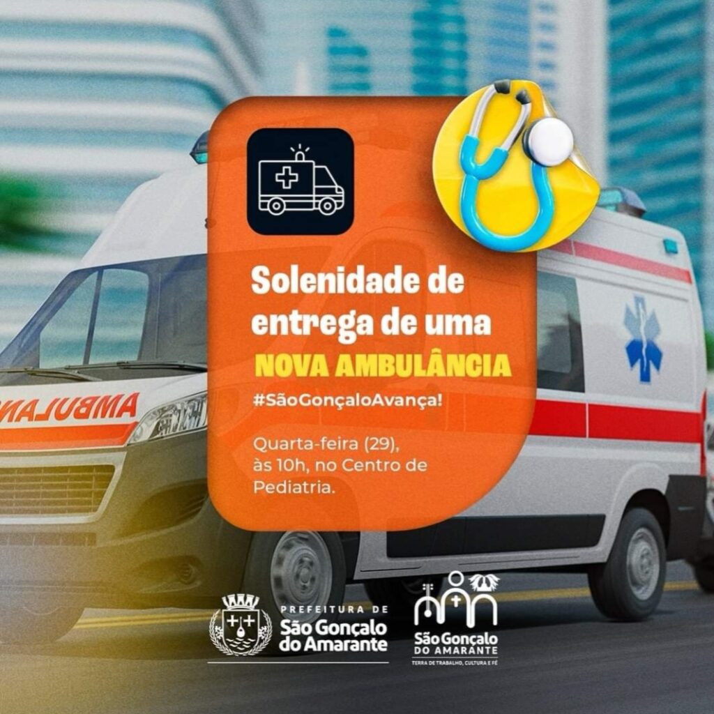 A Prefeitura de São Gonçalo tem o prazer de convidar todos para a solenidade de entrega de uma nova ambulância amanhã, quarta-feira, dia 29, às 10h.