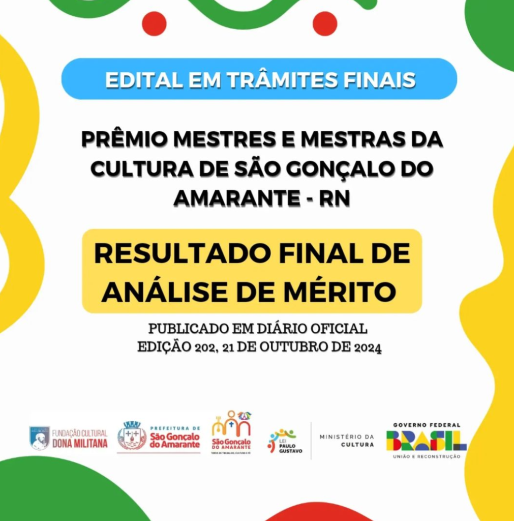 No último dia 21 de outubro de 2024, a Fundação Cultural Dona Militana divulgou o resultado final da análise de mérito cultural do Chamamento Público 11/2024, que tem como objetivo premiar 14 mestres e mestras da cultura popular de São Gonçalo do Amarante.
