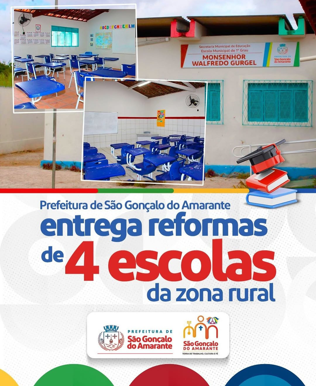 São Gonçalo do Amarante viveu mais um momento especial para a educação! A Prefeitura entregou as reformas de quatro importantes escolas na zona rural do município, reforçando o compromisso com a melhoria da infraestrutura escolar e a valorização da educação para todos.