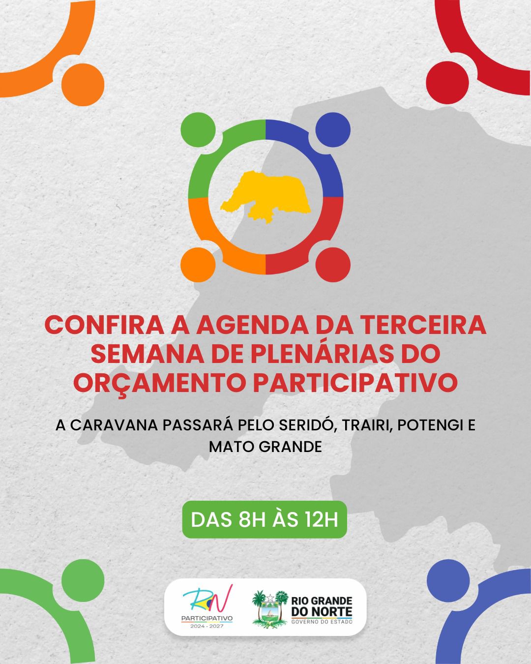 O Governo do Rio Grande do Norte, por meio da SEPLAN, realiza nesta semana a última etapa presencial do Orçamento Participativo 2026. A ação, que tem mobilizado a população em todo o estado, chega agora aos territórios do Seridó, Trairi, Central Potiguar e Mato Grande.