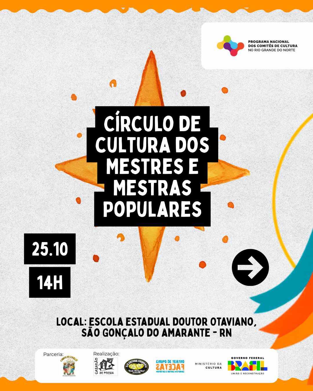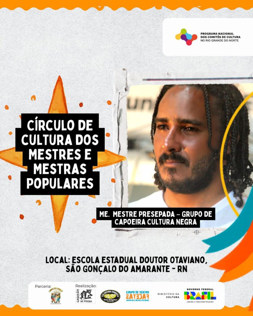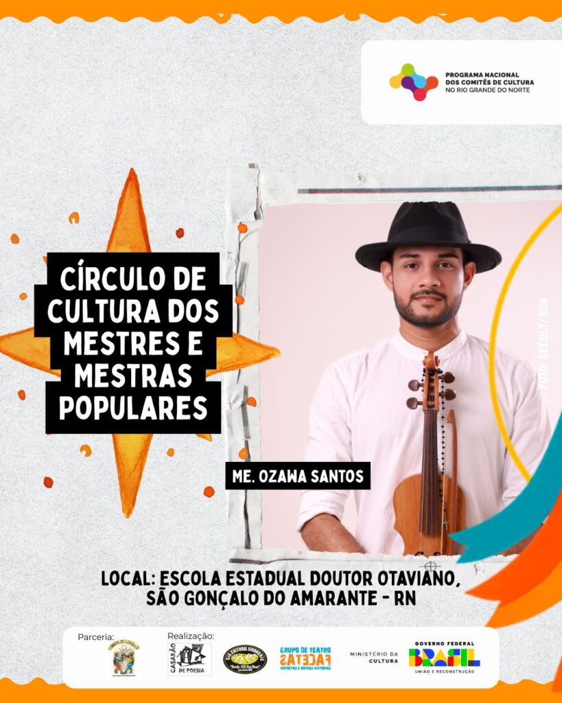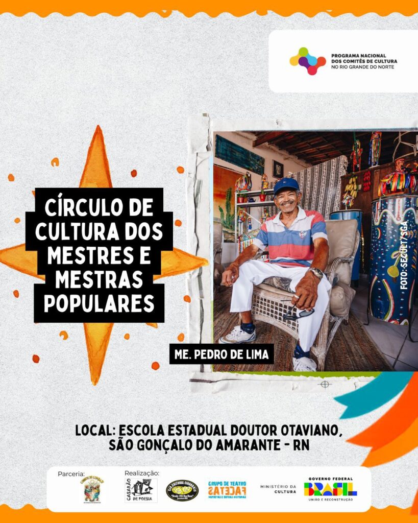 O encontro, mediado por Felipe Nunes e Vera Santana, reúne Mestres e Mestras da cultura popular potiguar, além de educadores(as), pesquisadores(as), representantes de movimentos sociais, grupos artísticos e instituições públicas.