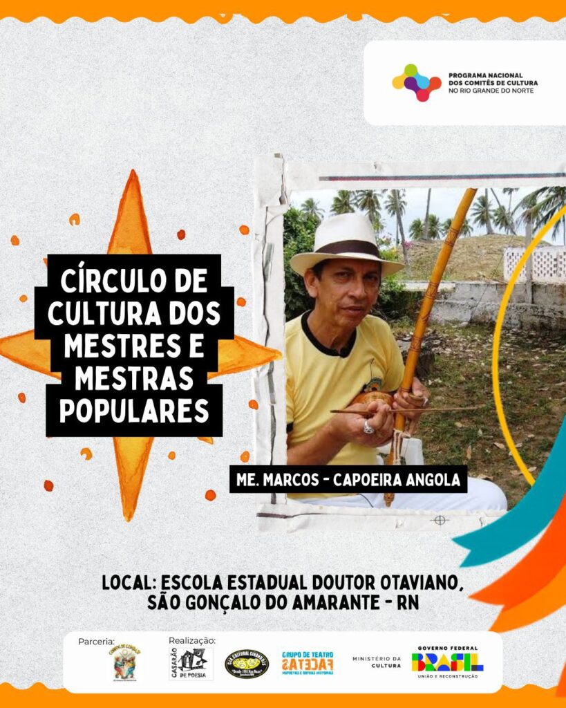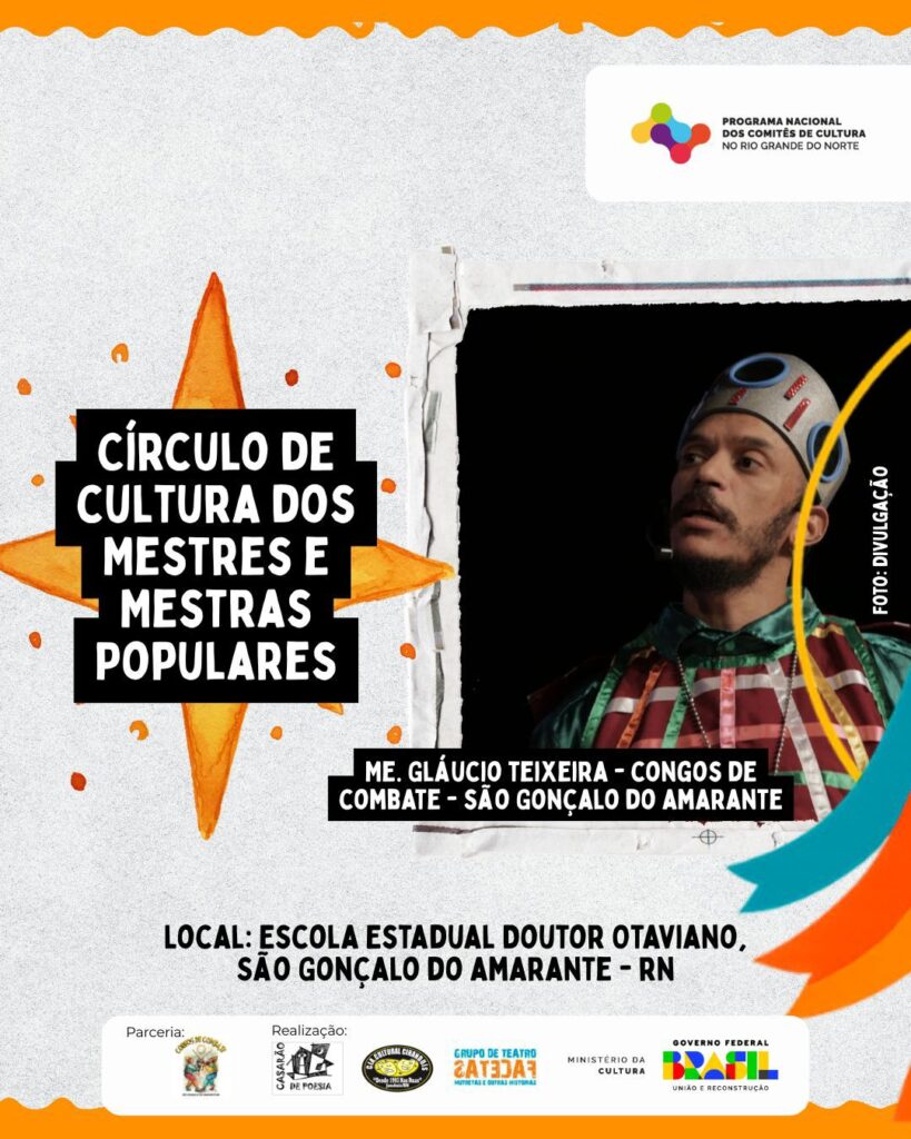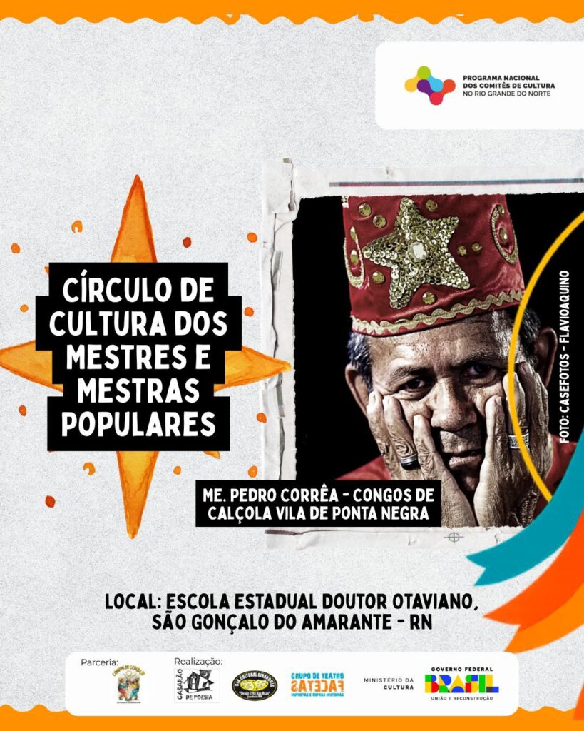 O Comitê de Cultura do RN e o Ponto de Cultura e Memória Congos de Combate RN realizam durante a VI Congada de São Benedito em São Gonçalo do Amarante, o primeiro Círculo de Cultura dos Mestres e Mestras Populares, com o tema “Valorização e reconhecimento dos saberes populares”.